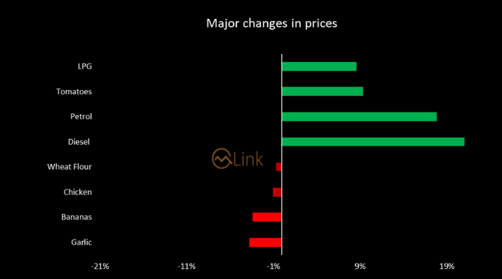 the prices of Diesel (54.71%), Petrol (17.86%), Tomatoes (9.35%), LPG (8.61%),