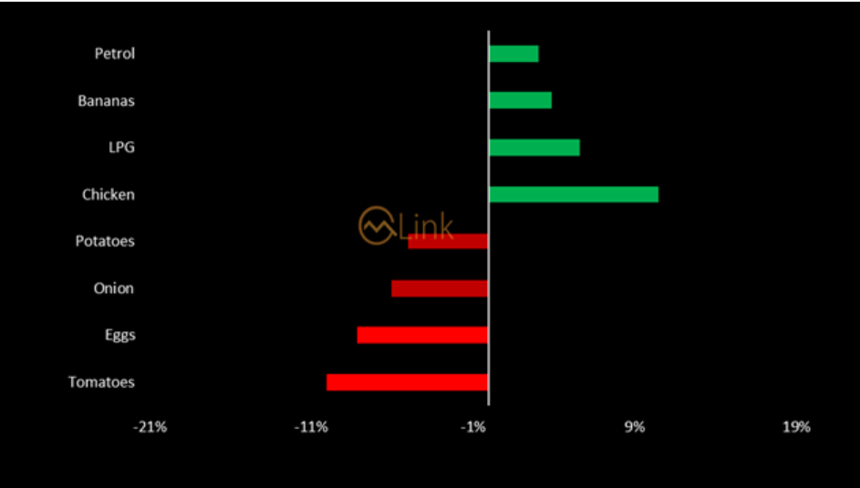 However, major decrease is observed in the prices of Potatoes (53.76%), Onions (26.10%), Eggs (24.93%), Garlic (22.25%), Chicken (21.70%), Pulse Gram (21.37%), Salt Powder (12.52%) and Pulse Masoor (10.71%).