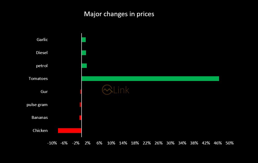 Major increase is observed in the prices of Tomatoes (46.44%), Petrol (1.72%), Diesel (1.45%), Garlic (1.41%), Onions (1.22%), Chilies Powder (0.72%), Mutton (0.59%), Beef (0.41%), Vegetable Ghee 1Kg (0.22%), Curd (0.19%) Lawn Printed (0.17%) and Cigarettes (0.07%).