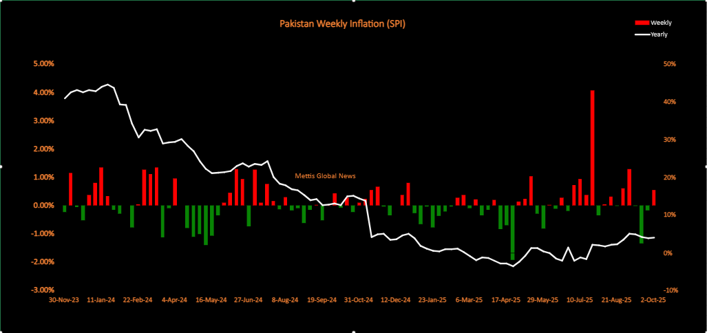 October 03, 2025 (MLN): Pakistan's short-term inflation increased by 0.56% compared to the previous week, while it rose by 4.07% compared to the same period last year, the Pakistan Bureau of Statistics (PBS) reported on Friday.