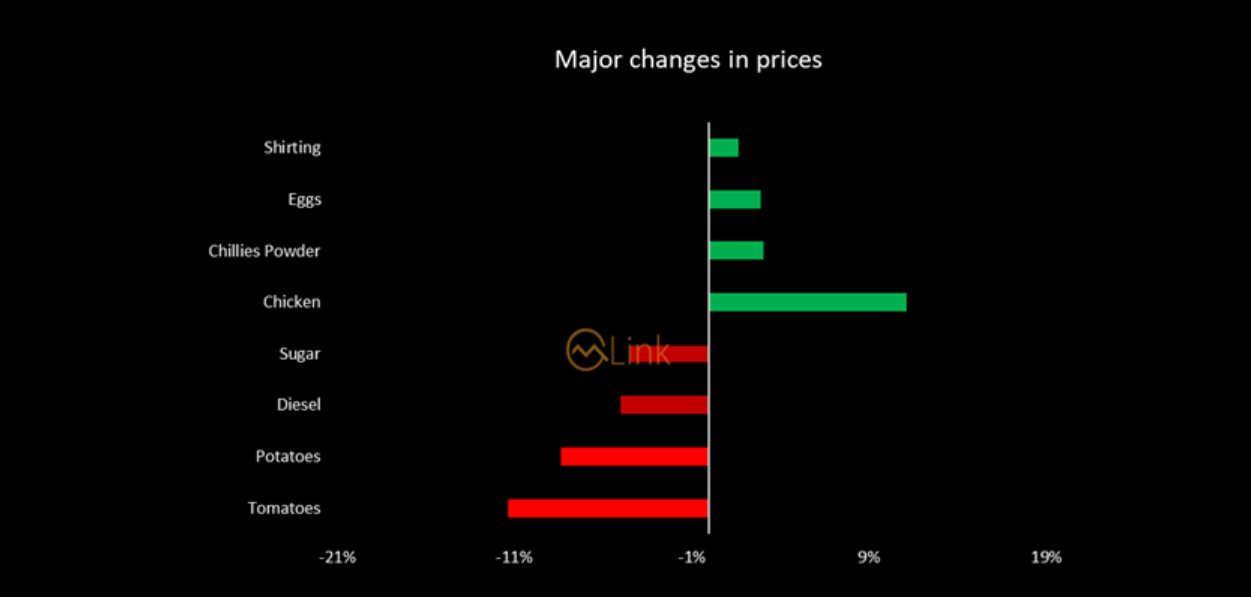 On the other hand, major decrease is observed in the prices of Tomatoes (11.38%), Potatoes (8.39%), Diesel (5.00%), Sugar (4.52%), Onions (3.52%), Pulse Mash (1.29%), Garlic (1.26%), Salt Powder (1.12%), Gur (1.05%) and LPG (0.14%).