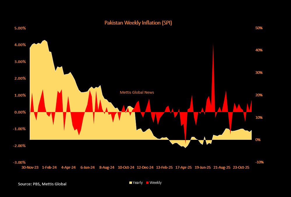 November 28, 2025 (MLN): Pakistan's short-term inflation, measured by the Sensitive Price Indicator (SPI), increased by 0.73% for the week ended November 27, 2025, driven primarily by a sharp hike in electricity charges for the lowest consumption slab and rising LPG costs, according to data released by the Pakistan Bureau of Statistics (PBS)