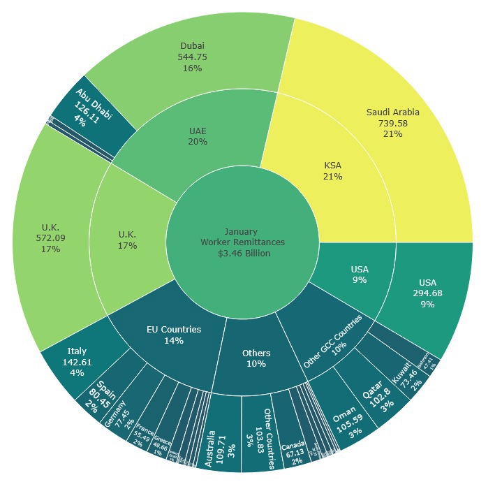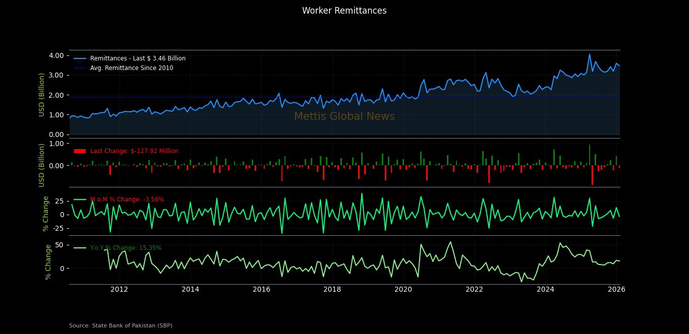 February 10, 2026 (MLN): Pakistan received workers' remittances of $3.46 billion in January 2026, down by 3.6% from December's $3.592bn, according to the latest data released by the State Bank of Pakistan (SBP).