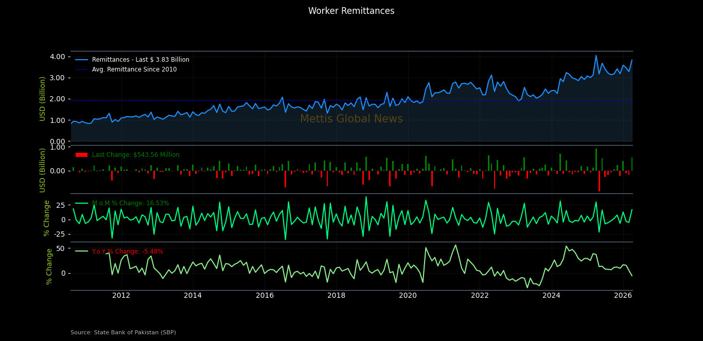 April 8, 2026 (MLN): Pakistan received workers' remittances of $3.83bn in March 2026, up 16.5% from February's $3.29bn, according to the latest data released by the State Bank of Pakistan (SBP).