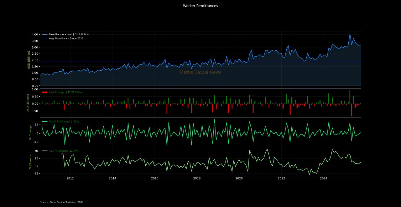 October 9, 2025 (MLN): Pakistan’s overseas workers sent home $3.18 billion in September 2025, reflecting a notable 1.45% increase MoM and a sharper 11.3% YoY, according to data released by the State Bank of Pakistan (SBP).