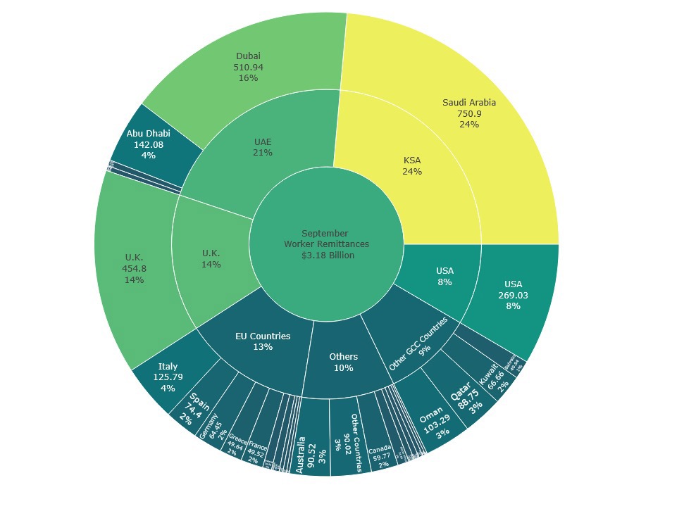 On a yearly basis, remittances increased by $324 million, compared to $2.86 billion in September 2024, driven primarily by higher inflows from Saudi Arabia, the UAE, and the UK.