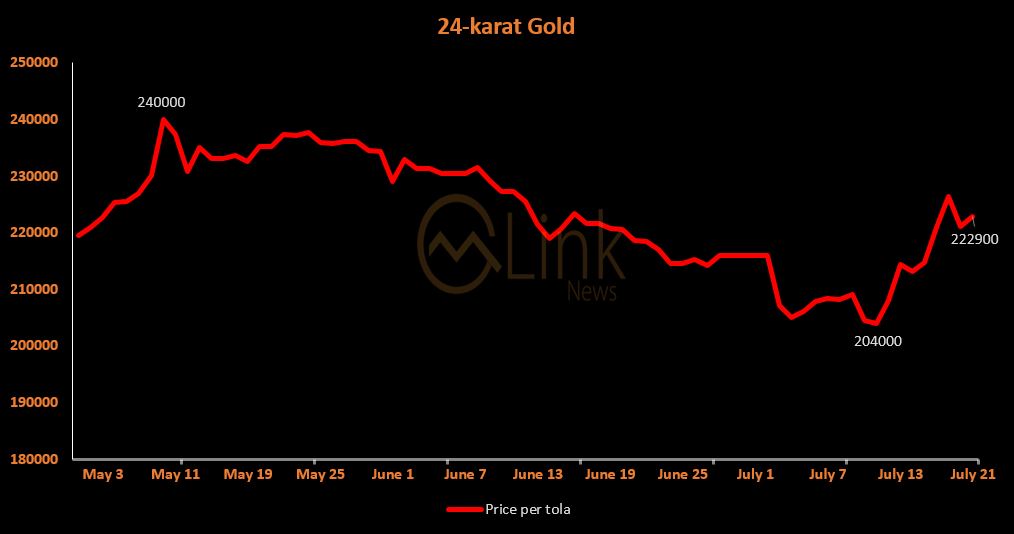 July 21, 2023 (MLN): Domestic bullion rebounded on Friday, with 24-karat gold reaching Rs222,900 per tola, rising by Rs1,800.
