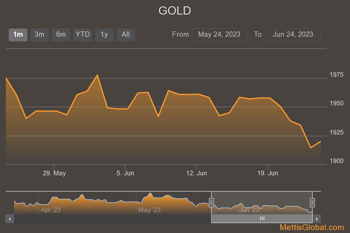June 24, 2023 (MLN): Domestic bullion went down on Saturday, extending losses throughout the week with 24-karat gold closing at Rs214,500 per tola, dipping by Rs2,500 on the day.