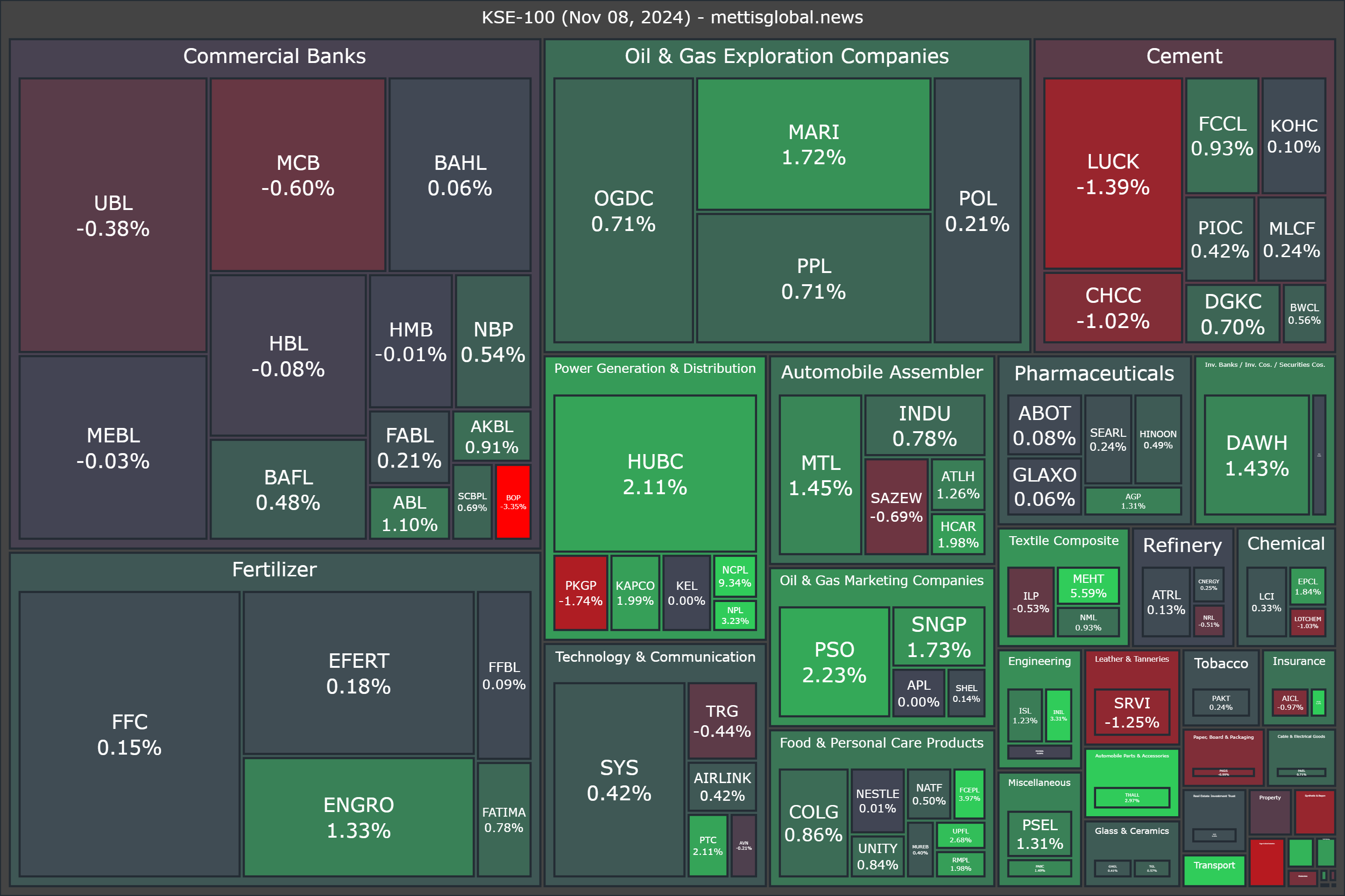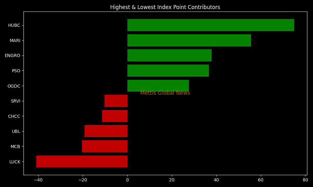 In terms of index-point contributions, companies that propped up the index were HUBC (+74.97pts), MARI (+55.67pts), ENGRO (+37.90pts), PSO (+36.59pts), and OGDC (+27.62pts).