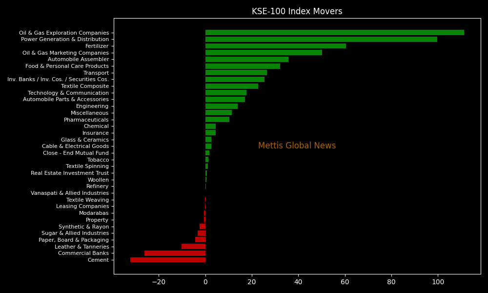 While the index was let down by Cement (-32.17pts), Commercial Banks (-26.15pts), Leather & Tanneries (-10.19pts), Paper, Board & Packaging (-4.26pts), and Sugar & Allied Industries (-3.20pts).