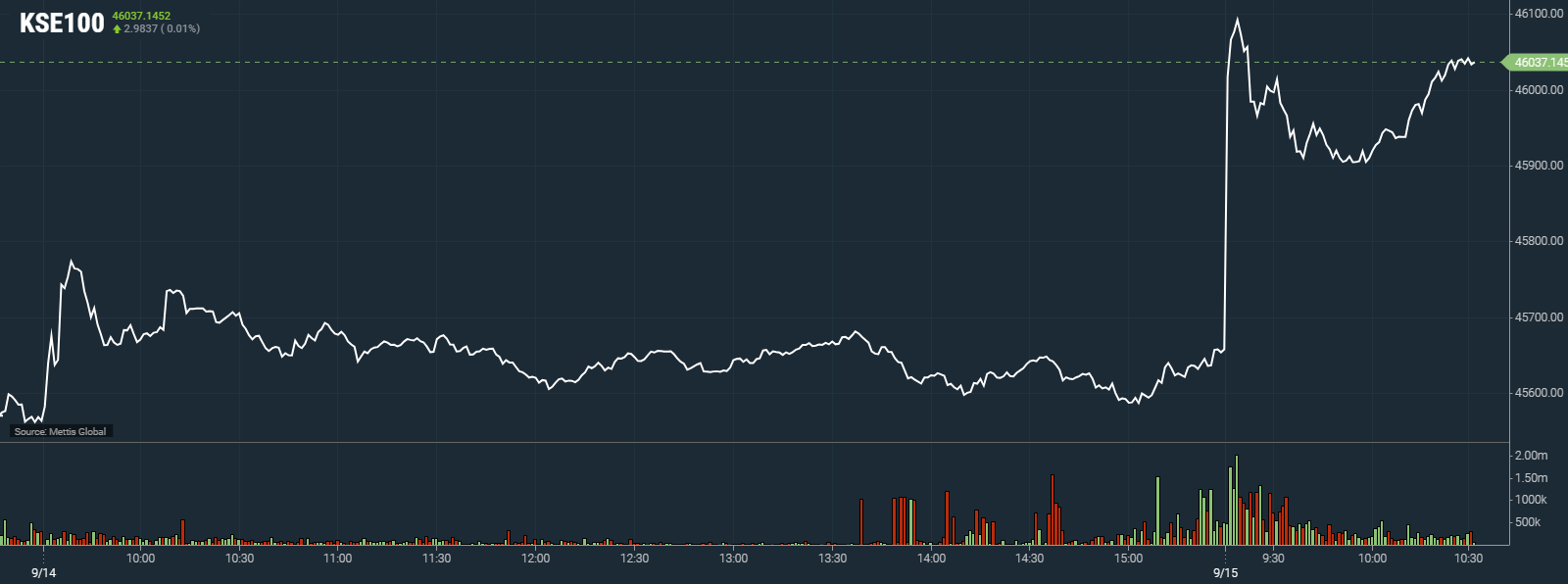 September 15, 2023 (MLN): The benchmark KSE-100 Index has regained the crucial 46,000 level, rising by around 390 points or 0.81% on Friday during early trade [10:34am PST].