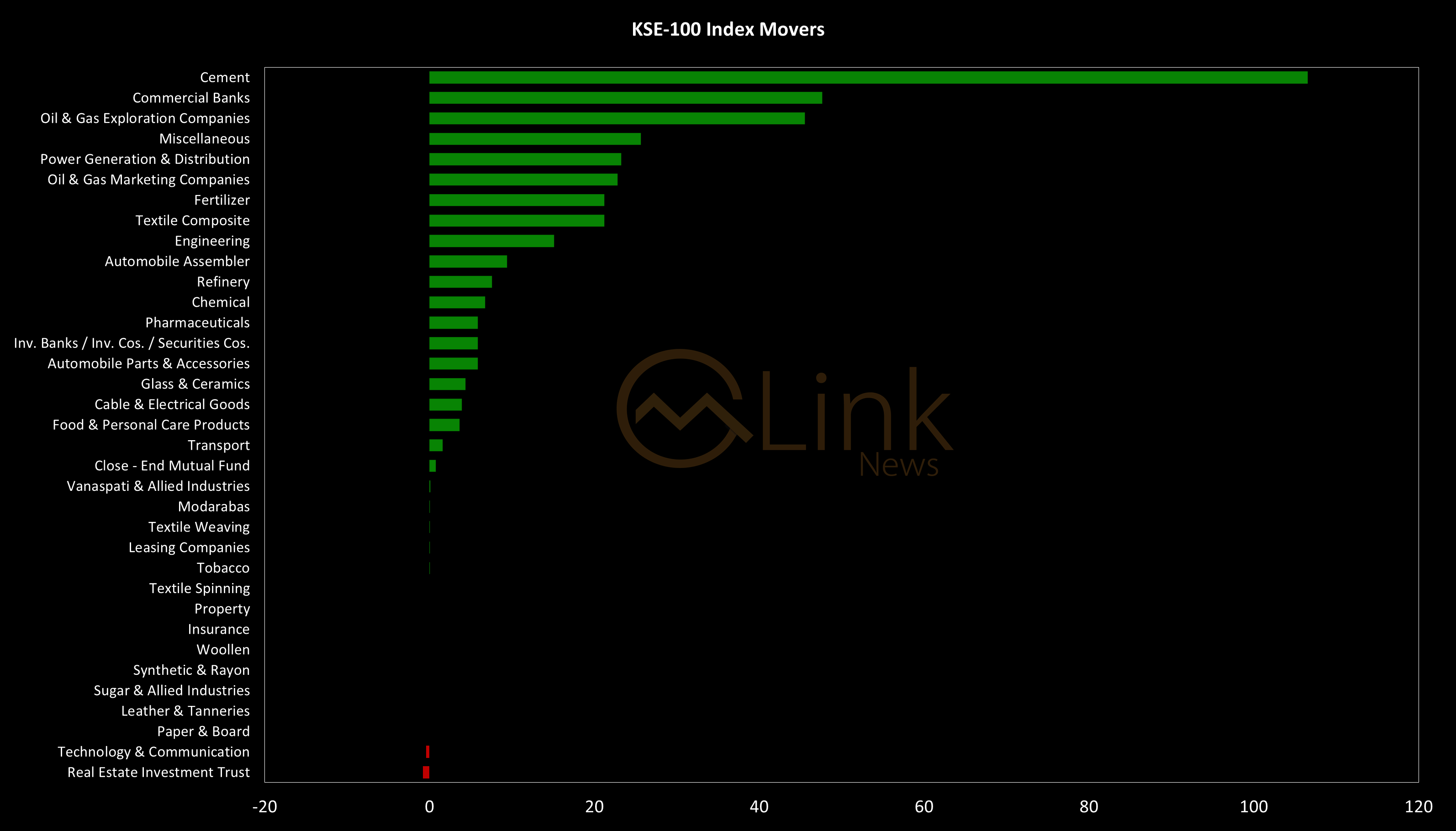 The KSE-100 index gained points from various sectors, led by Cement with 106.54pts. Other sectors that contributed positively were Commercial Banks with 47.64, Oil & Gas Exploration Companies with 45.53, Miscellaneous with 25.63, and Power Generation & Distribution with 23.26pts.