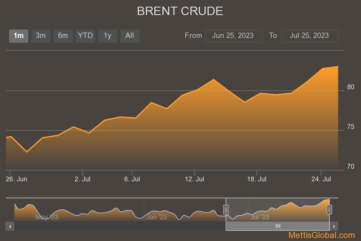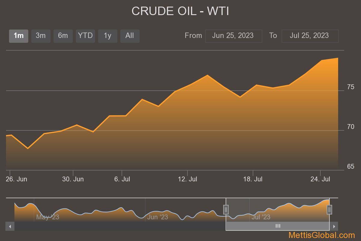 July 25, 2023 (MLN): Oil prices continued the upward trajectory amid supply concerns and the optimism of Chinese stimulus outweighing more rate hikes from U.S. and European central banks.