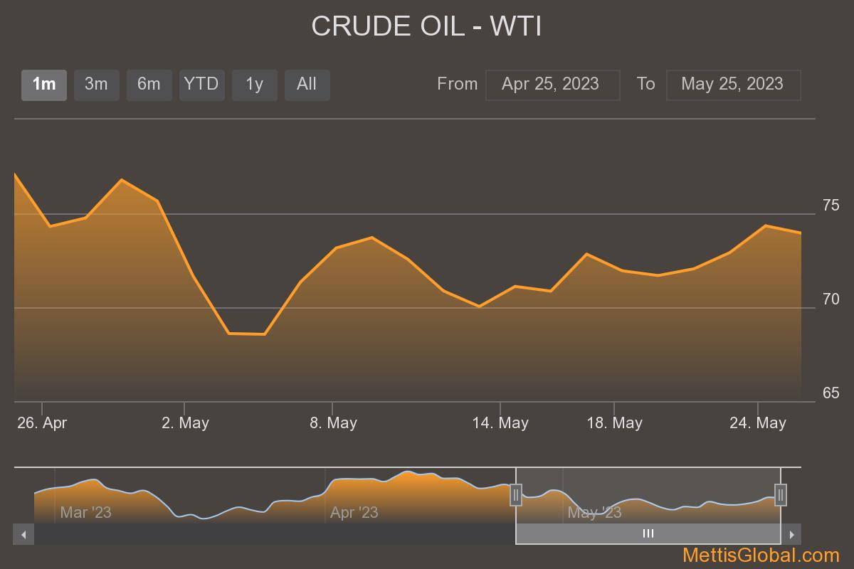 May 25, 2023 (MLN): Oil prices dropped on Thursday with investors remaining cautious as the debt ceiling has still not been finalized after the talks on Wednesday, and the clock is ticking with only a week left before June 1.