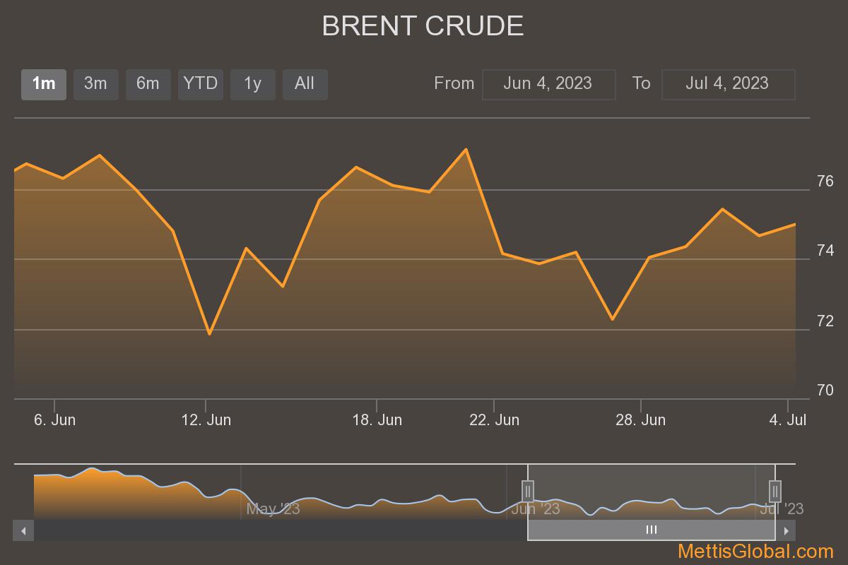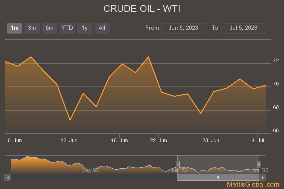 July 04, 2023 (MLN): Oil prices rose on Tuesday amid supply cuts for August imposed by Saudi Arabia and Russia outweighing mixed views on economic data that could hint at weak crude demand.