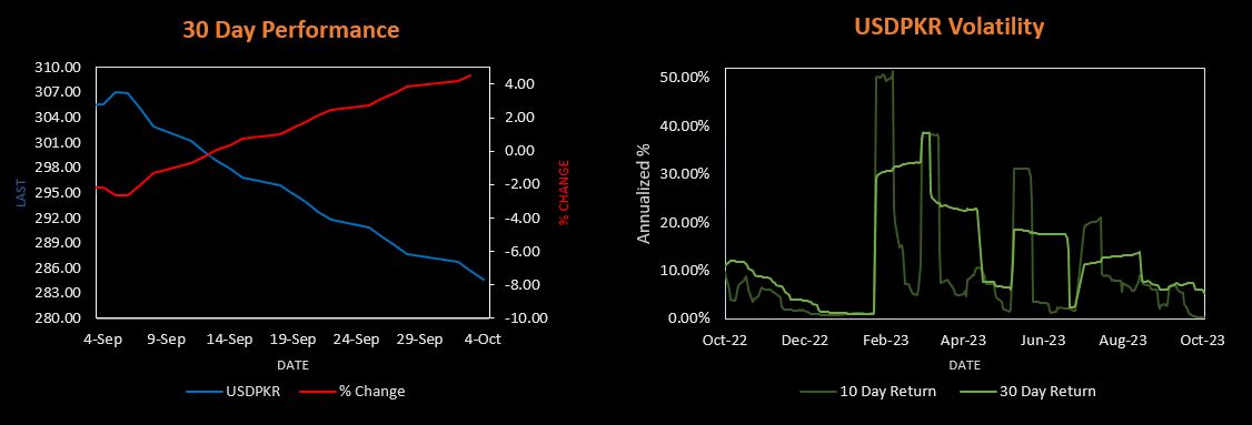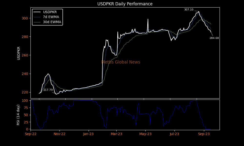 October 04, 2023 (MLN): The Pakistani rupee (PKR) appreciated by 1.04 rupees against the US dollar in Wednesday's interbank session as the currency settled the trade at PKR 284.68 per USD, compared to the previous session's closing of PKR 285.72 per USD.
