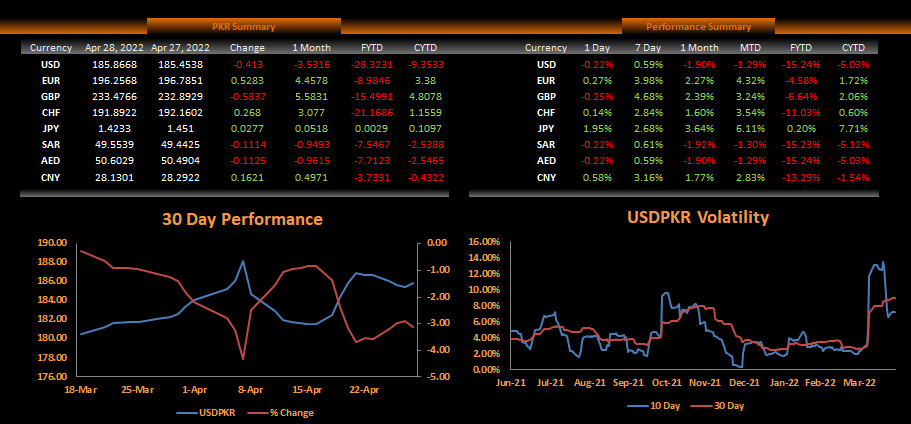 April 28, 2022 (MLN): Snapping its gaining streak, the Pakistani rupee (PKR) depreciated by 41 paisa against the US dollar in today's interbank session as the currency settled the trade at PKR 185.87 compared to yesterday's closing of PKR 185.45 per USD.