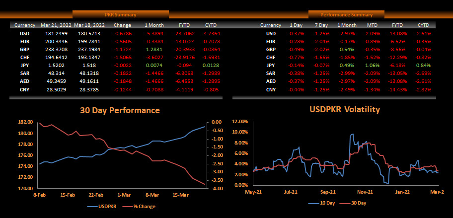 March 21, 2022 (MLN): Enduring its losing momentum, the Pakistani rupee (PKR) has slipped further by 68 paisa against the greenback in today's interbank session as the currency closed the trade at PKR 181.25.