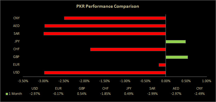 On the other hand, the performance of PKR remained comparatively better against GBP and JPY as it appreciated by 0.54% and 0.49%, respectively during one month. However, during the same period, it has weakened by 2.99%, 2.97%, 2.49%, 1.85%, and 0.17% against SAR, AED, CNY, and CHF respectively.
