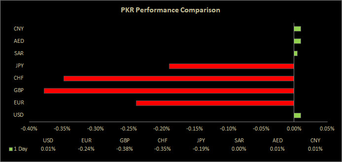 Alternatively, the currency lost 90 paisa to the Pound Sterling as the day's closing quote stood at PKR 238.84 per GBP, while the previous session closed at PKR 237.94 per GBP.