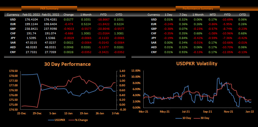 February 02, 2022 (MLN): Pakistani rupee (PKR) kept its gaining streak intact against the greenback in today’s interbank session as the currency settled the trade at PKR 176.41, witnessing a meagre gain of 2 paisa.