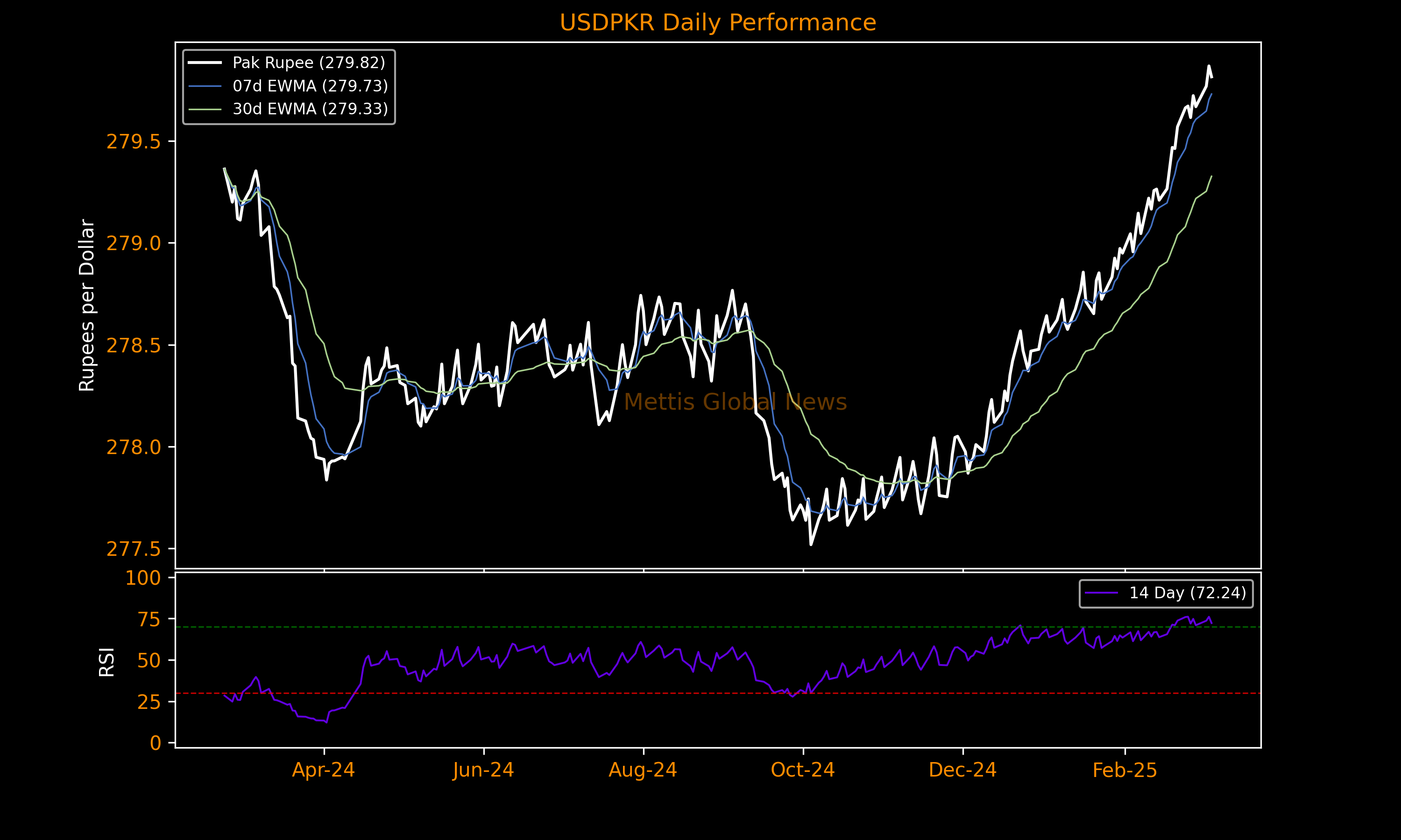 March 06, 2025 (MLN): The Pakistani rupee (PKR) gained by 5.33 paisa or 0.02% against the US dollar in Thursday's interbank session to settle the trade at PKR 279.82 per USD, compared to previous closing of 279.87.
