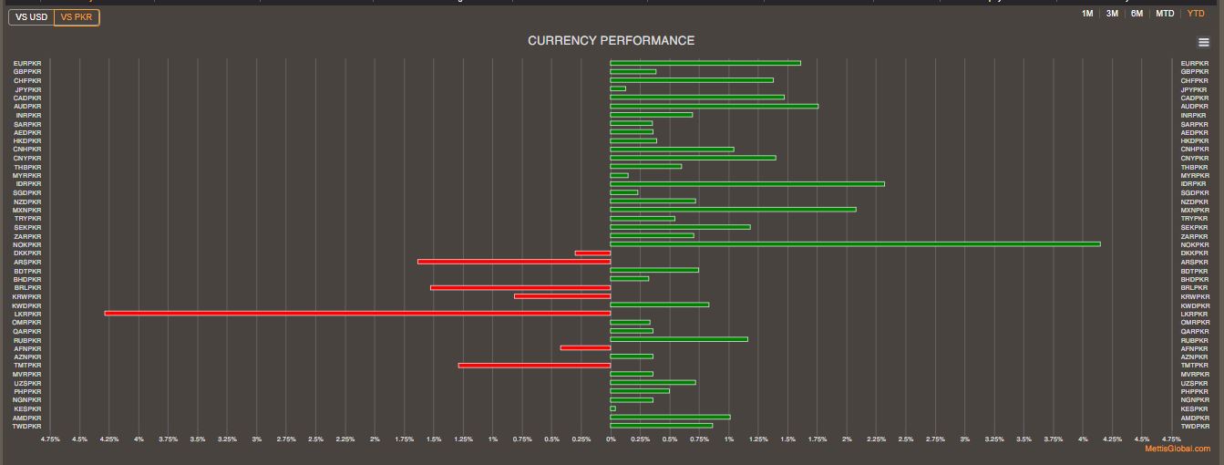 On the other hand, the performance of PKR remained comparatively better against major currencies during the fiscal year to date as the local unit appreciated by 1.75%, 1.61%, 1.47%, 1.39% and 1.37% against AUD, EUR, CAD, CNY and CHF, respectively.