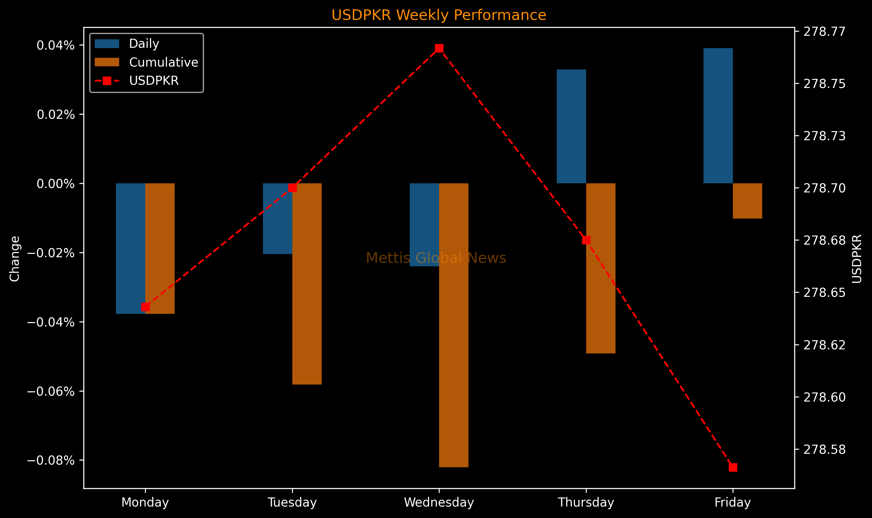 September 06, 2024 (MLN): The Pakistani rupee (PKR) appreciated by 10.88 paisa or 0.04% against the US dollar in Friday's interbank session to settle the trade at PKR 278.57 per USD, compared to previous closing of 278.68.
