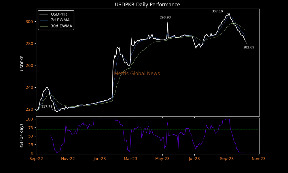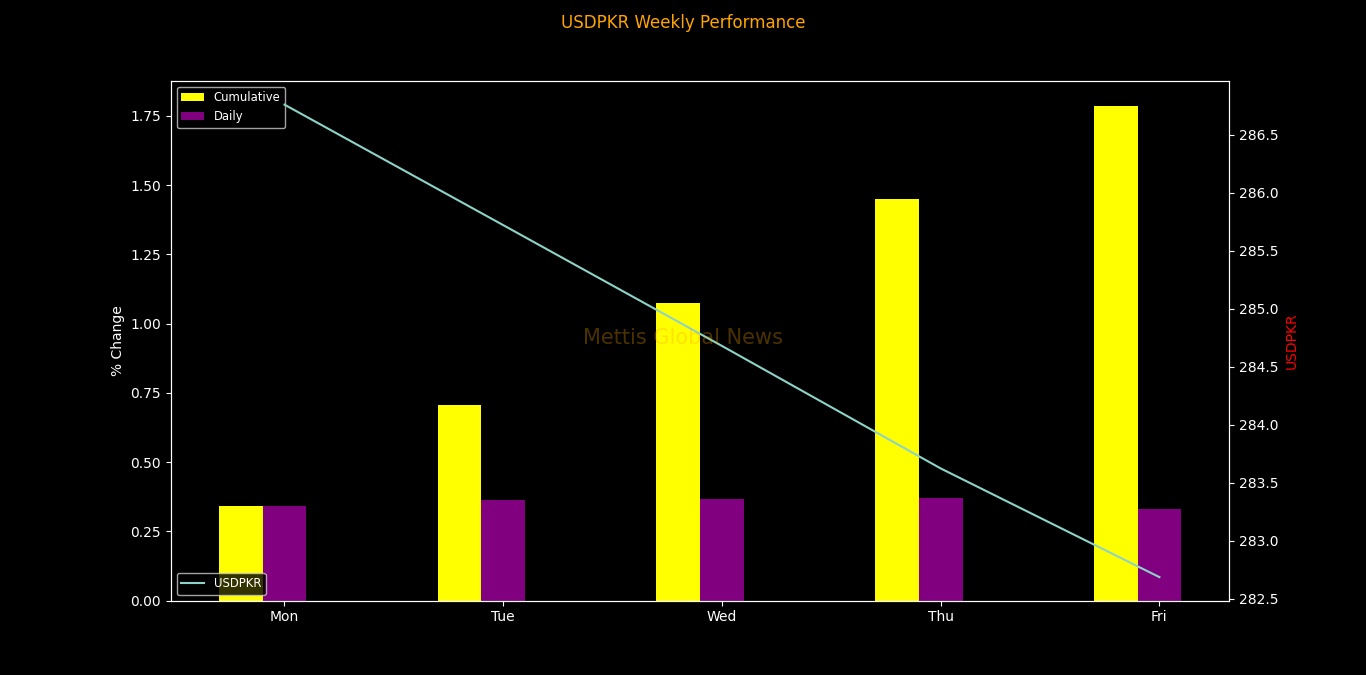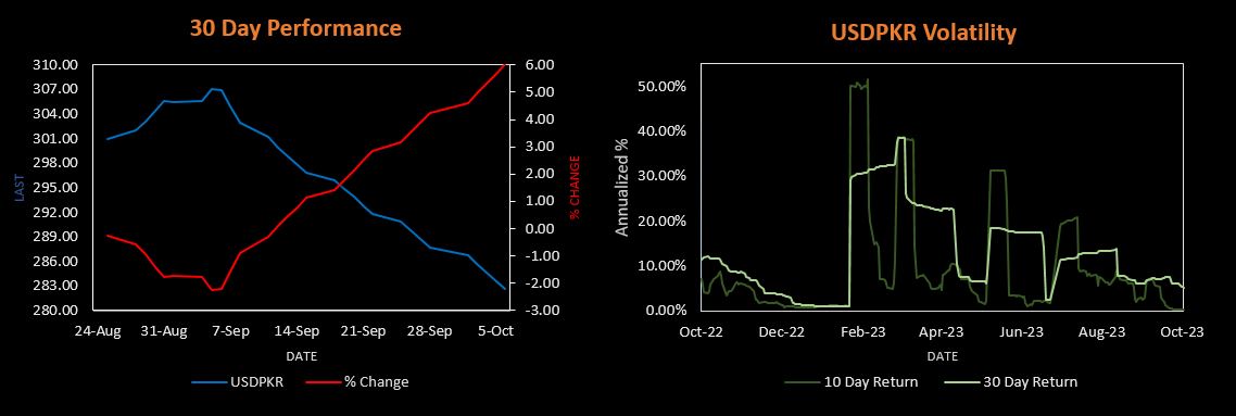 October 06, 2023 (MLN): The Pakistani rupee (PKR) appreciated by over 5 rupees against the U.S. dollar this week to settle the trade at PKR 282.68 per USD, compared to the previous week’s closing of PKR 287.74 per USD.