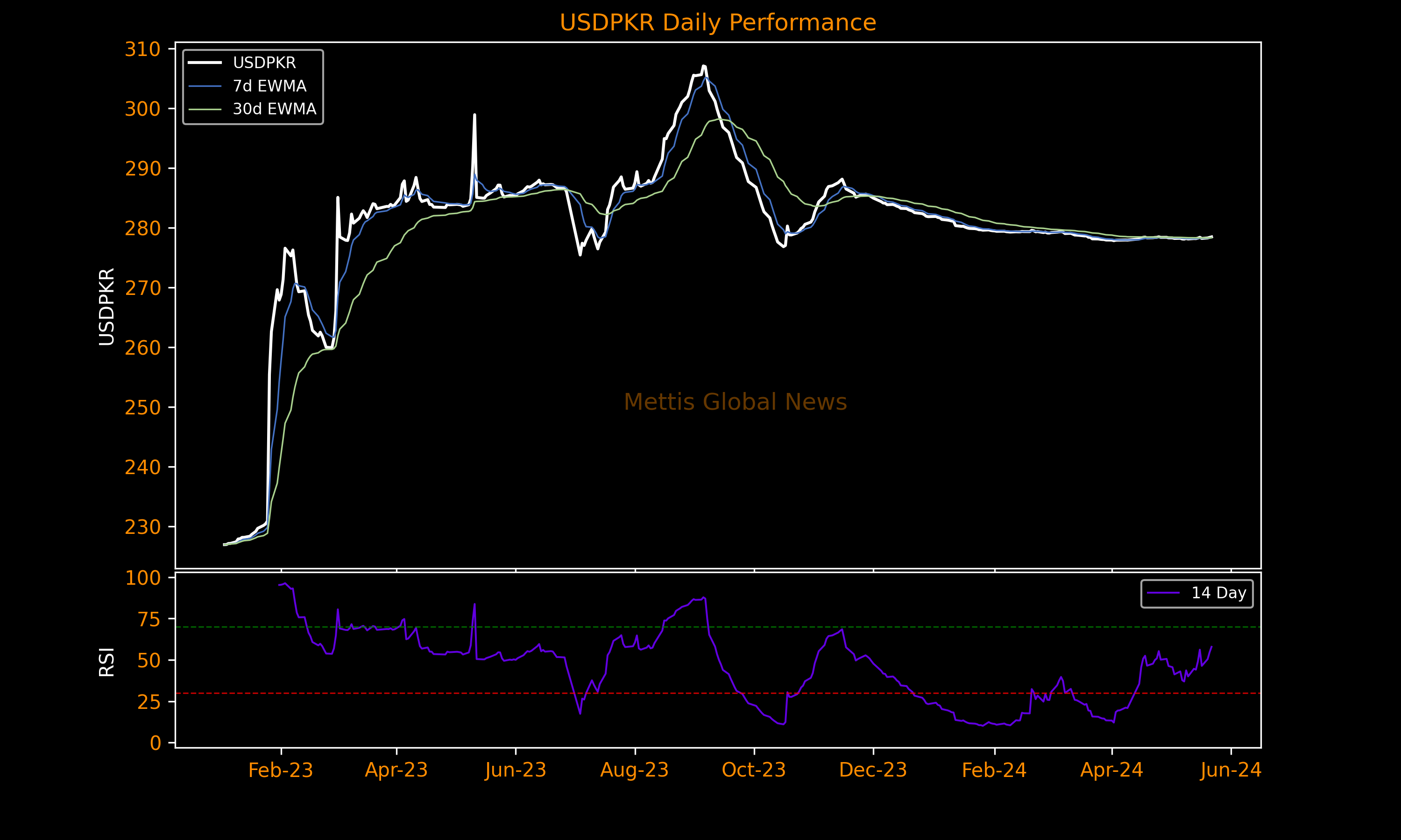 May 22, 2024 (MLN): The Pakistani rupee (PKR) depreciated by 8.29 paisa against the US dollar in Wednesday's interbank session as the currency settled the trade at PKR 278.47 per USD, compared to the previous session's closing of PKR 278.39 per USD.