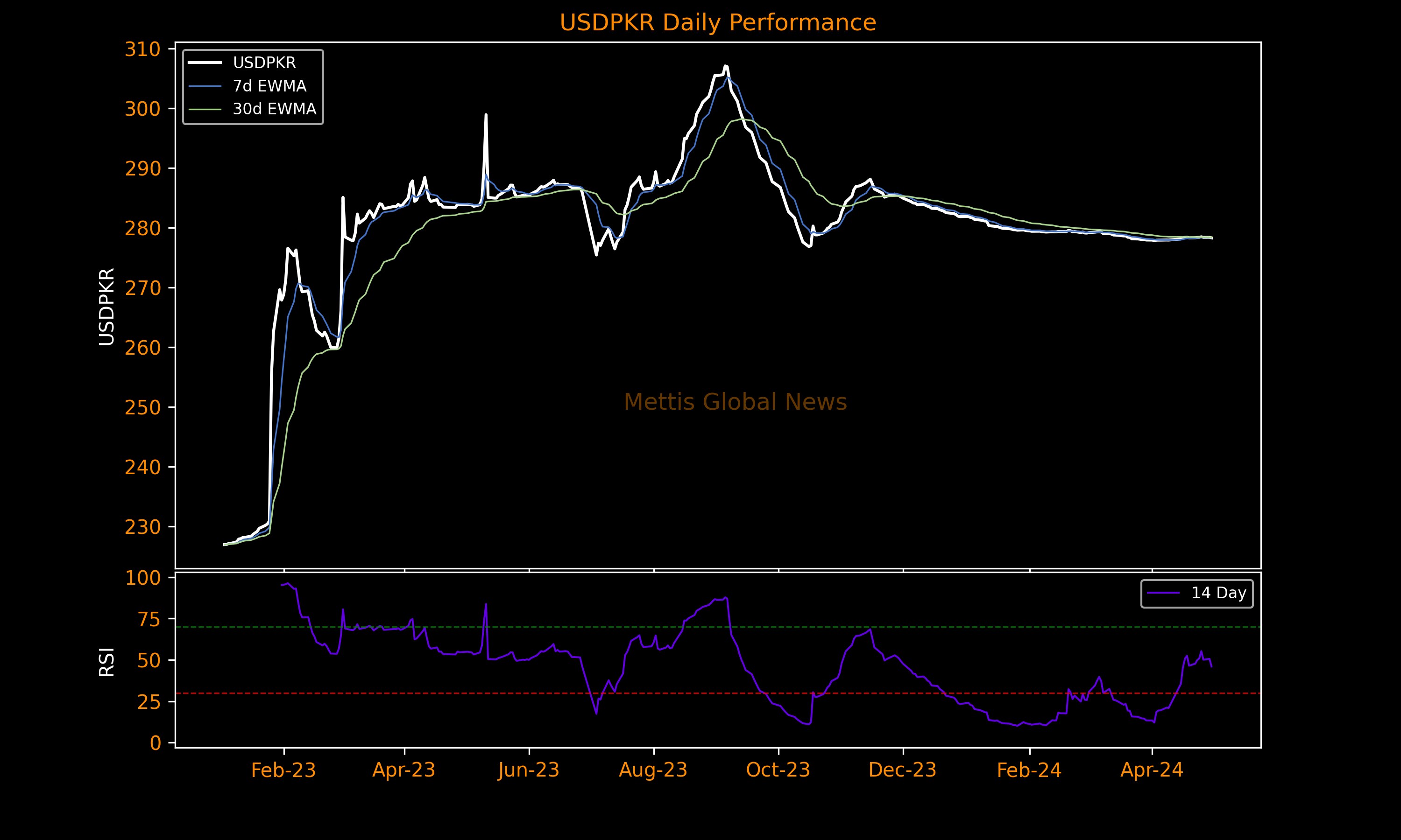April 30, 2024 (MLN): The Pakistani rupee (PKR) appreciated by 8.34 paisa against the US dollar in Tuesday's interbank session as the currency settled the trade at PKR 278.31 per USD, compared to the previous session's closing of PKR 278.4 per USD.