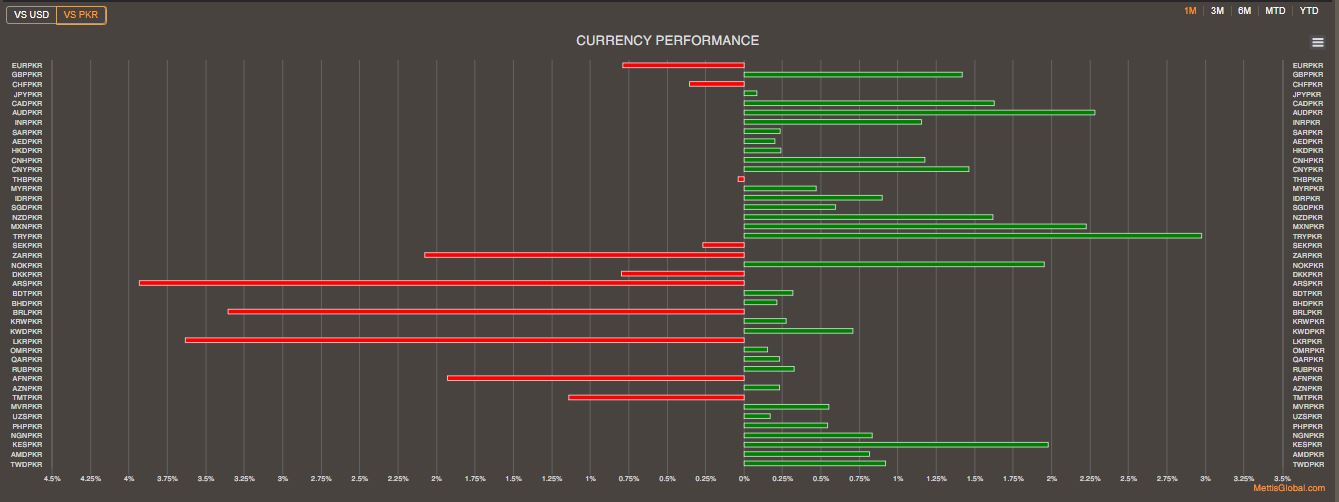 However, the performance of PKR remained comparatively better against major currencies during one month as the local unit appreciated by 2.28%, 1.62%, 1.46%, and 1.41% against AUD, CAD, CNY, and GBP, respectively. On the other hand, PKR has depreciated by 0.78% against EUR and lost some ground by 0.35% against CHF.