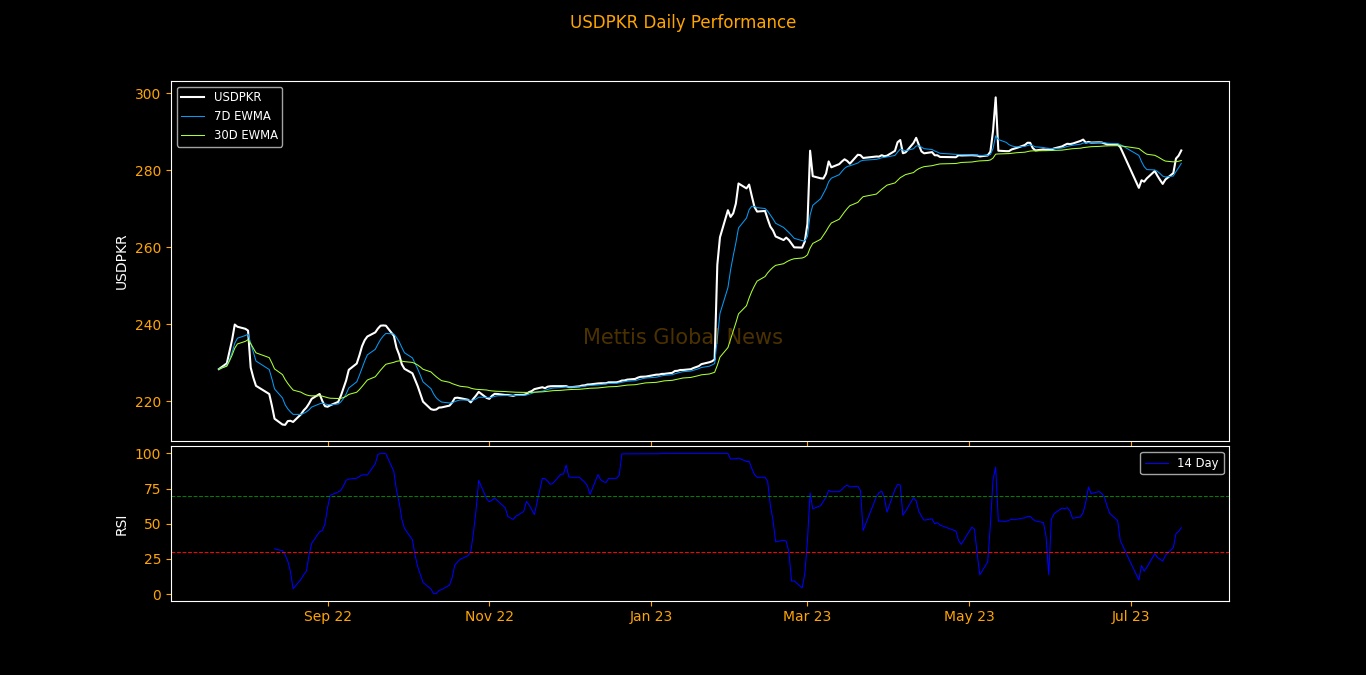 July 20, 2023 (MLN): The Pakistani rupee (PKR) faced more pressure by depreciating around 1.35 rupees against the US dollar in Thursday's interbank session as the currency settled the trade at PKR 285.15 per USD, compared to the previous session's closing of PKR 283.80 per USD.