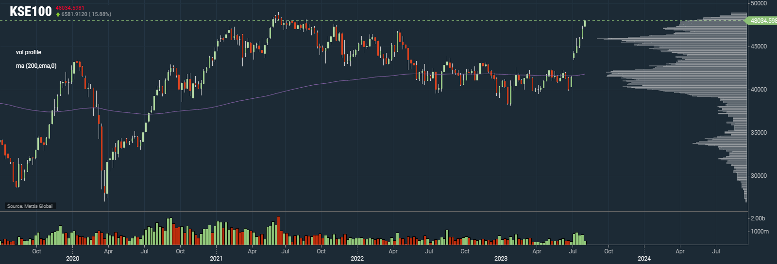 July 31, 2023 (MLN): The benchmark KSE-100 index crossed the 48,000 point mark after 24 months, last seen in August 2021, with the KSE-100 gaining a staggering 957.6 points or 2.03% DoD to close at 48,034.6pts.