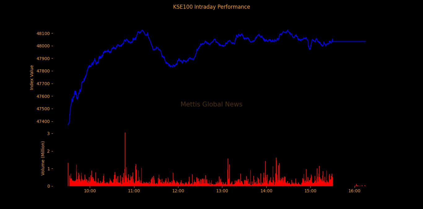 The index remained positive throughout today's session touching an intraday high of 48,126.5.