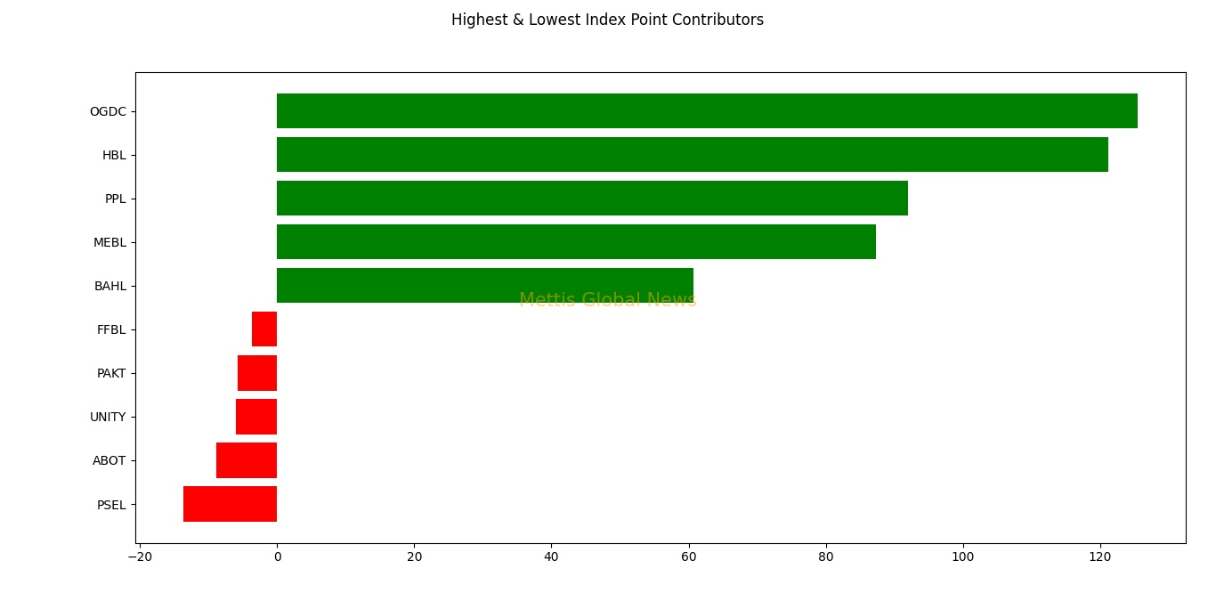 Companies adding points to the index were OGDC with 125.48, HBL with 121.11, PPL with 91.95, MEBL with 87.28 and BAHL with 60.66 points.