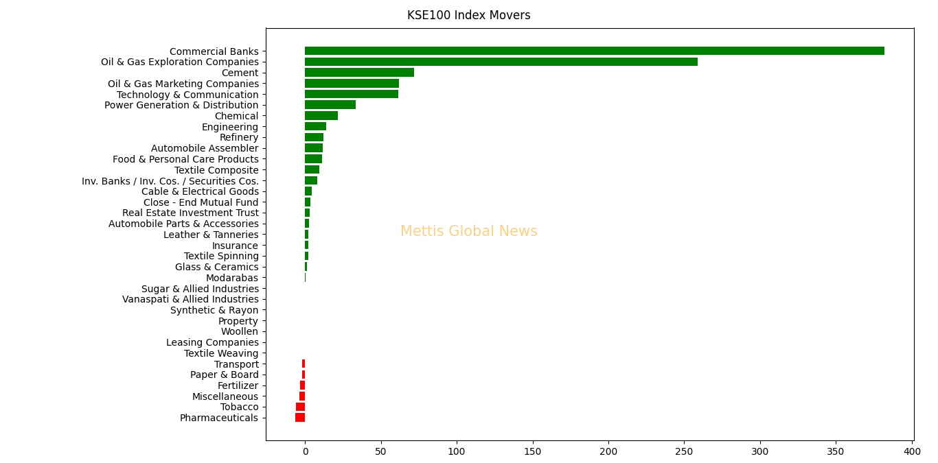 KSE100 index was supported by Commercial Banks with 382.0, Oil & Gas Exploration Companies with 258.89, Cement with 71.92, Oil & Gas Marketing Companies with 61.97 and Technology & Communication with 61.65 points.