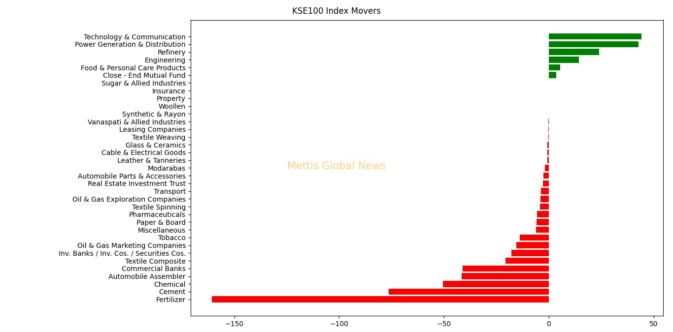 KSE100 index was supported by Technology & Communication with 44.22, Power Generation & Distribution with 42.82, Refinery with 24.11, Engineering with 14.28, and Food & Personal Care Products with 5.38 points.