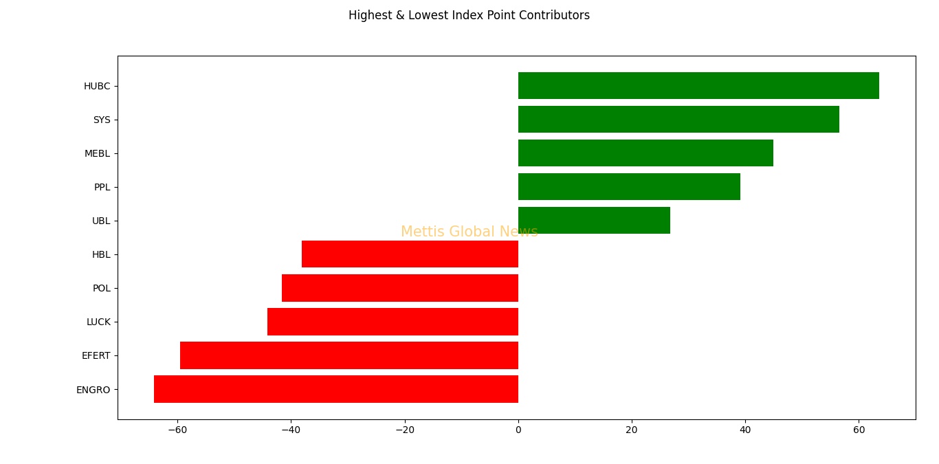Companies adding points to the index were HUBC with 63.6, SYS with 56.59, MEBL with 44.94, PPL with 39.16, and UBL with 26.79 points.