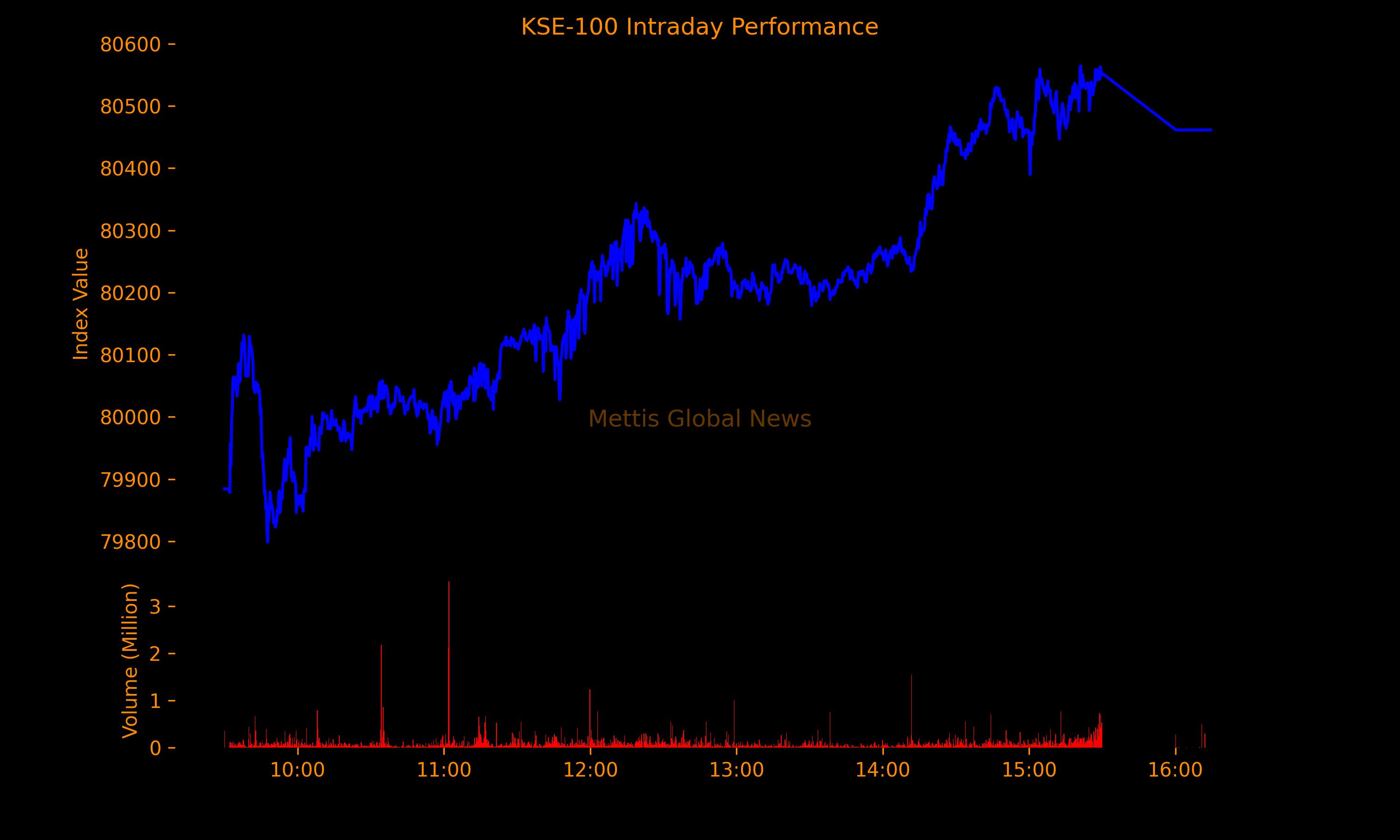 The index remained positive throughout the day showing an intraday high of 80,587.44 (+1,096.31) and a low of 79,798.75 (+307.62) points.