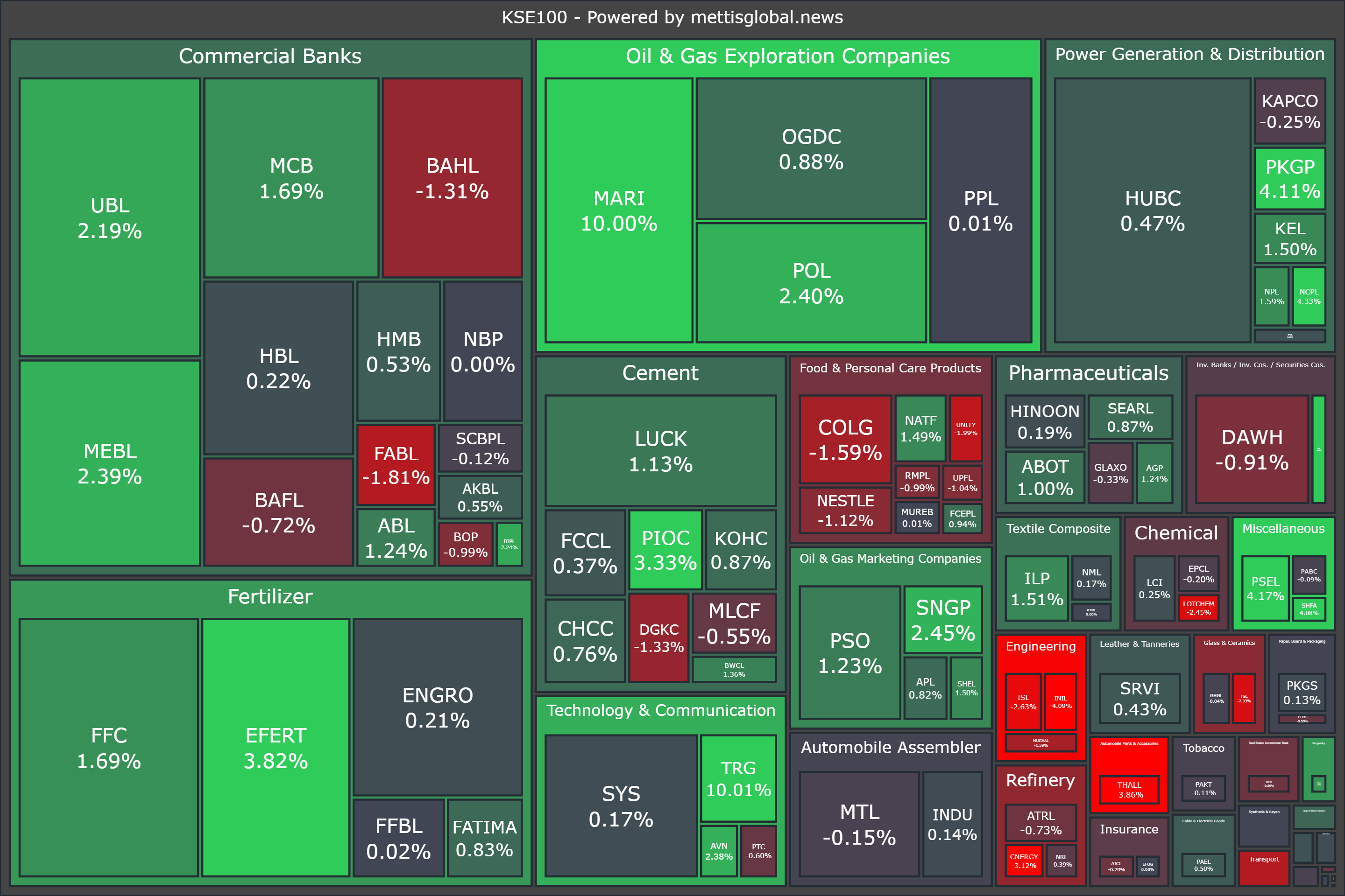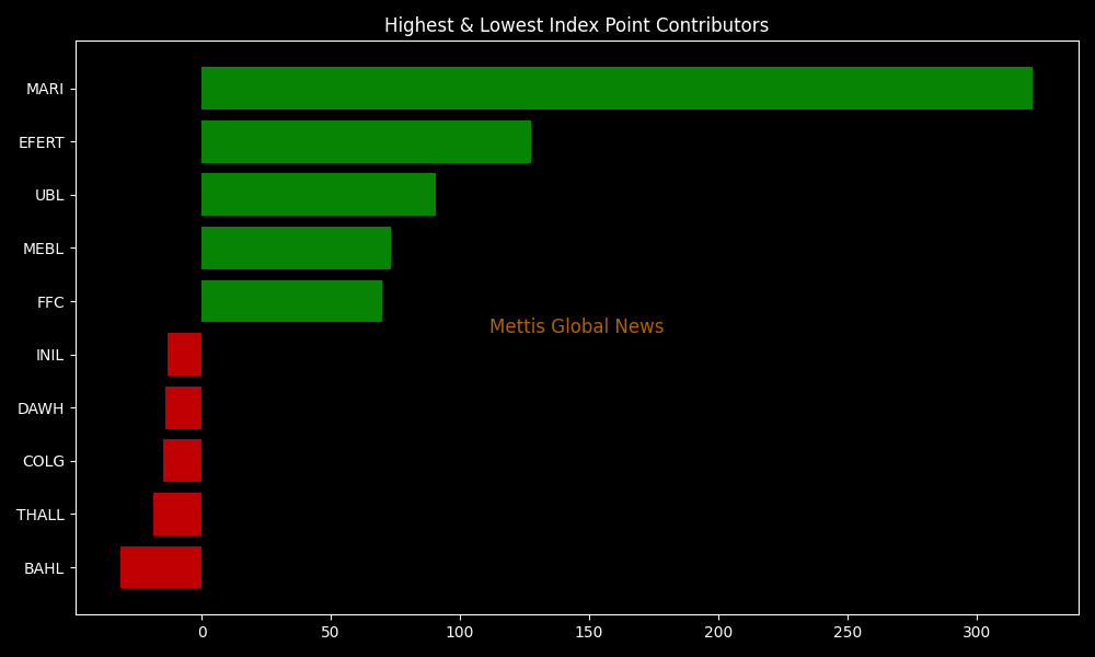 In terms of index-point contributions, companies that propped up the index were MARI (+321.92pts), EFERT (+127.65pts), UBL (+90.60pts), MEBL (+73.48pts), and FFC (+69.70pts).