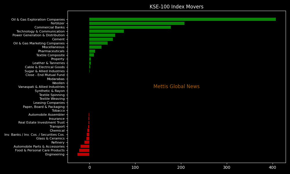 Sector-wise, KSE-100 Index was supported by Oil & Gas Exploration Companies (+407.01pts), Fertilizer (+207.78pts), Commercial Banks (+178.13pts), Technology & Communication (+74.99pts), and Power Generation & Distribution (+56.55pts).
