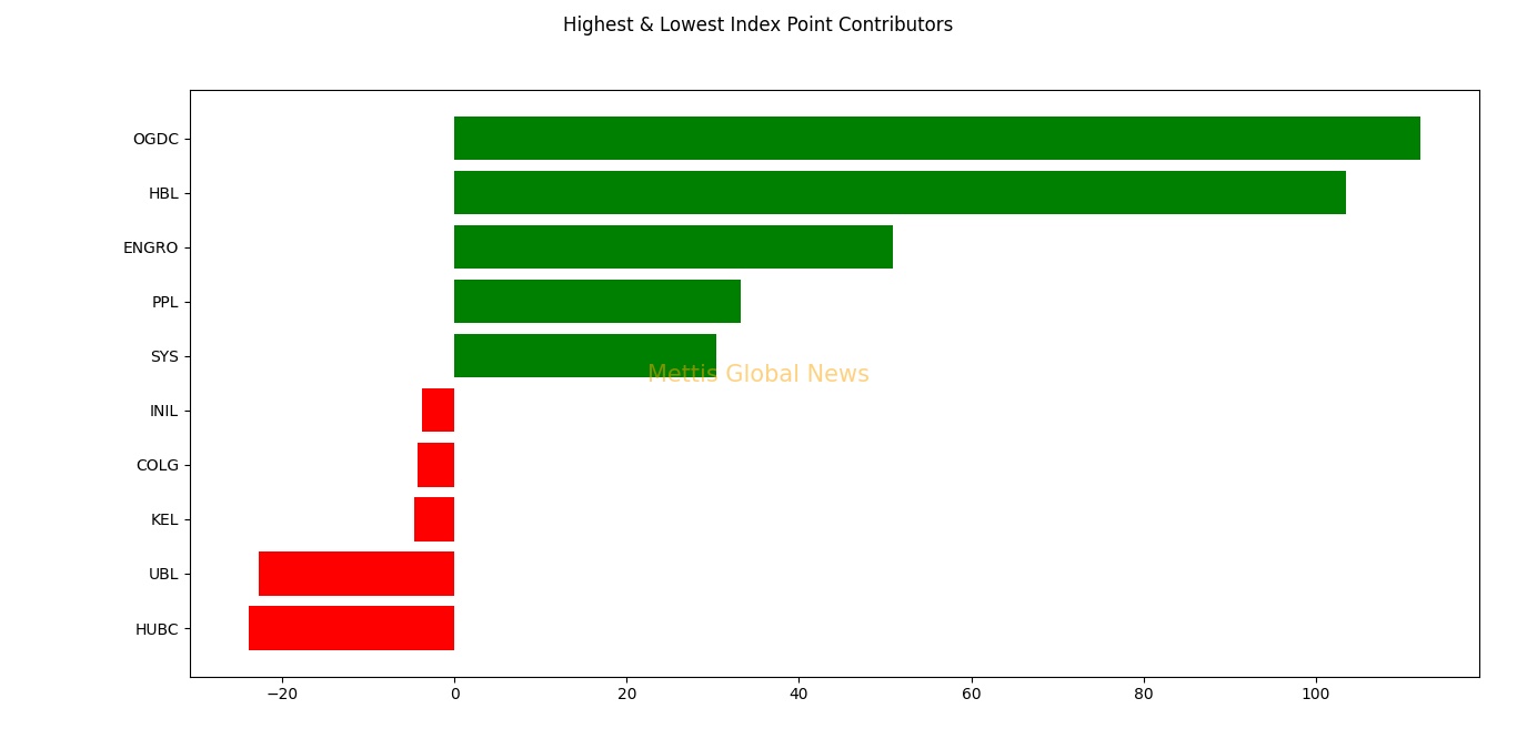Companies adding points to the index were OGDC with 112.17, HBL with 103.57, ENGRO with 50.9, PPL with 33.23 and SYS with 30.38 points.