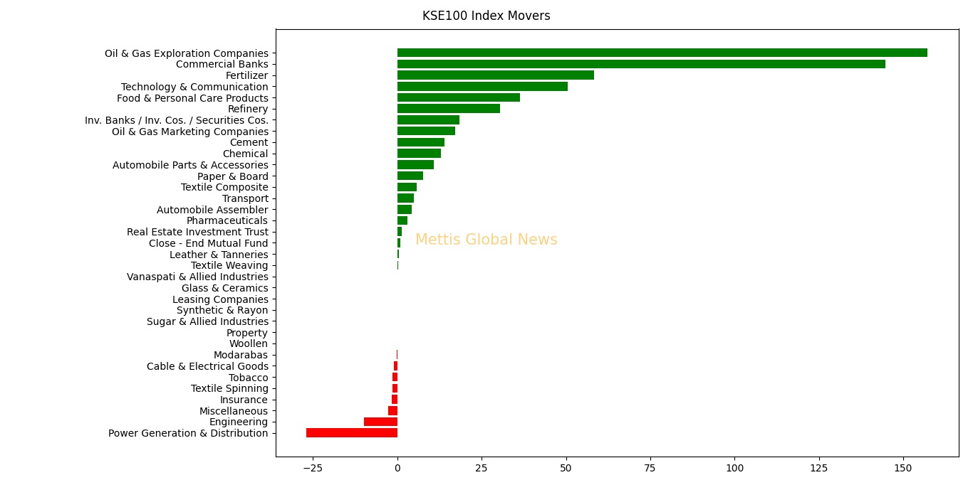 KSE100 index was supported by Oil & Gas Exploration Companies with 157.14, Commercial Banks with 144.79, Fertilizer with 58.4, Technology & Communication with 50.47 and Food & Personal Care Products with 36.34 points.