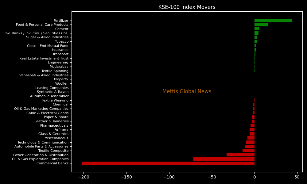 On the flip-side, the index was supported by Fertilizer (43.9pts), Food & Personal Care Products (15.99pts), Cement (5.78pts), Inv. Banks / Inv. Cos. / Securities Cos. (4.68pts), and Sugar & Allied Industries (3.24pts).