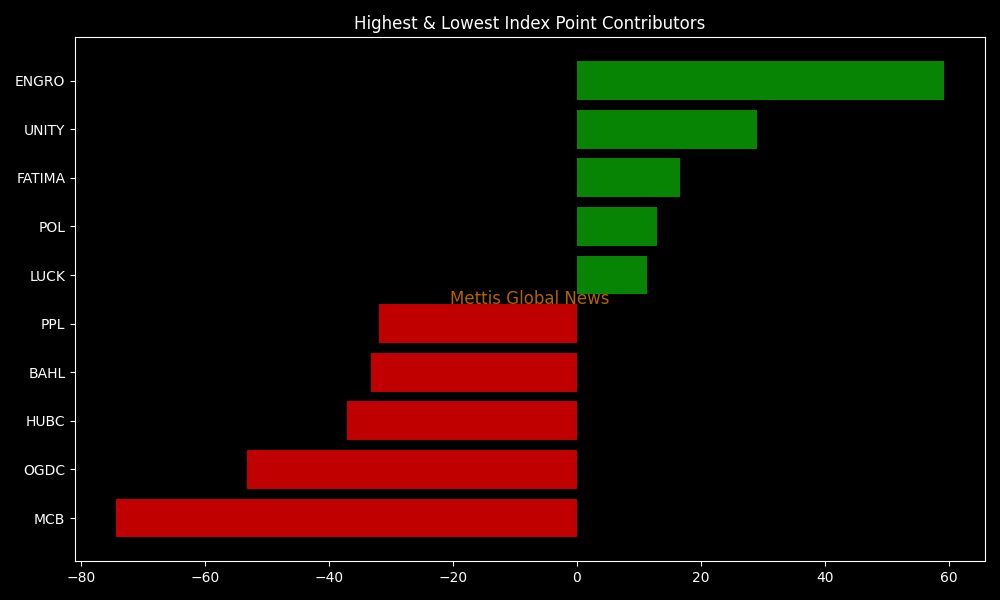 On the other hand, companies that added points to the index were ENGRO (59.18pts), UNITY (29.13pts), FATIMA (16.58pts), POL (12.9pts), and LUCK (11.3pts).