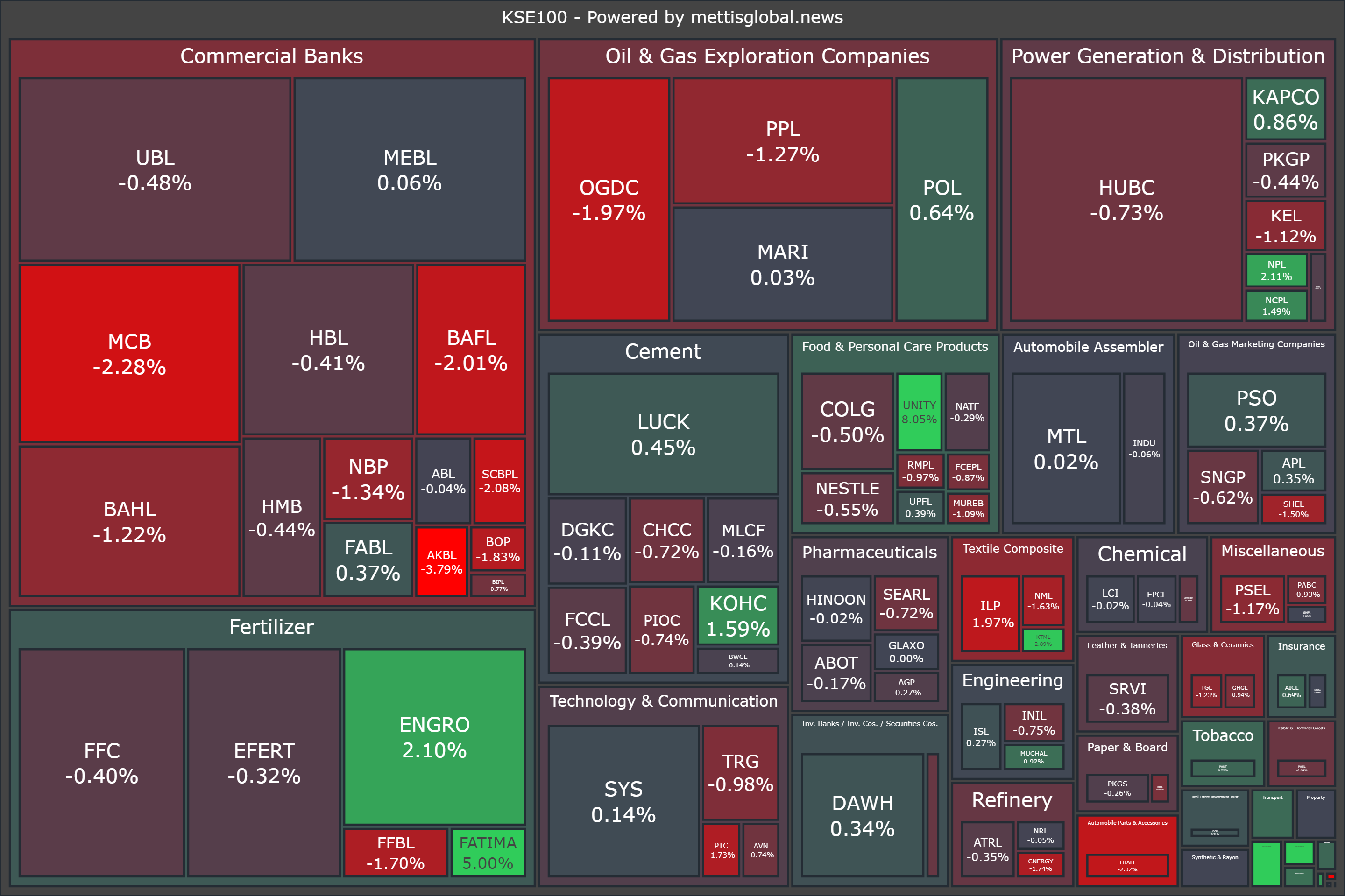 KSE-100 index was let down by Commercial Banks (201.87pts), Oil & Gas Exploration Companies (71.44pts), Power Generation & Distribution (32.55pts), Textile Composite (13.75pts), and Automobile Parts & Accessories (11.08pts).