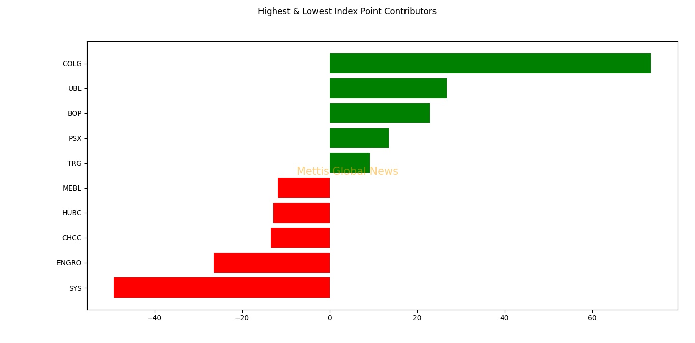 Companies dragging the index lower were SYS with 49.28, ENGRO with 26.51, CHCC with 13.48, HUBC with 12.83 and MEBL with 11.8 points.