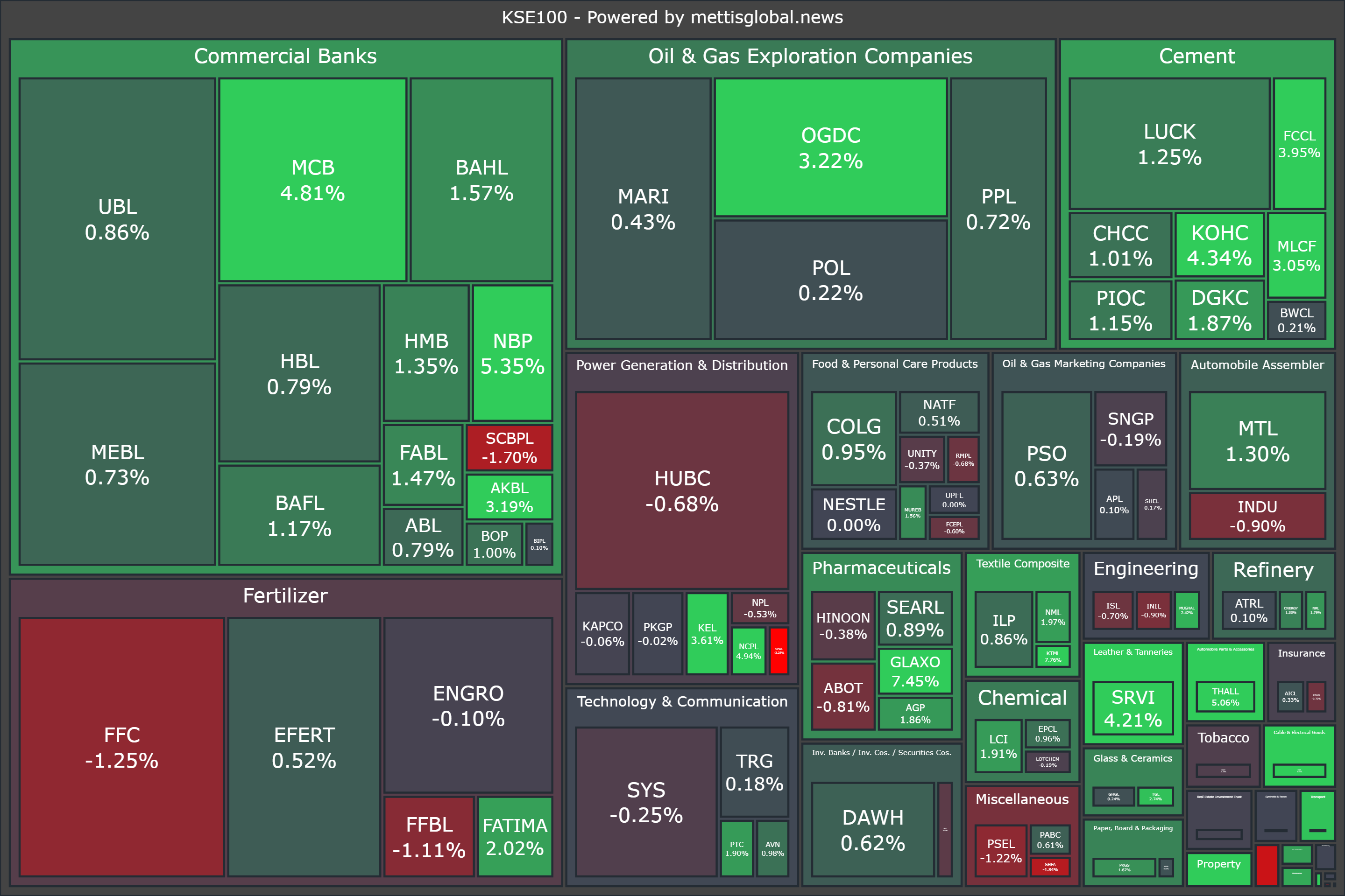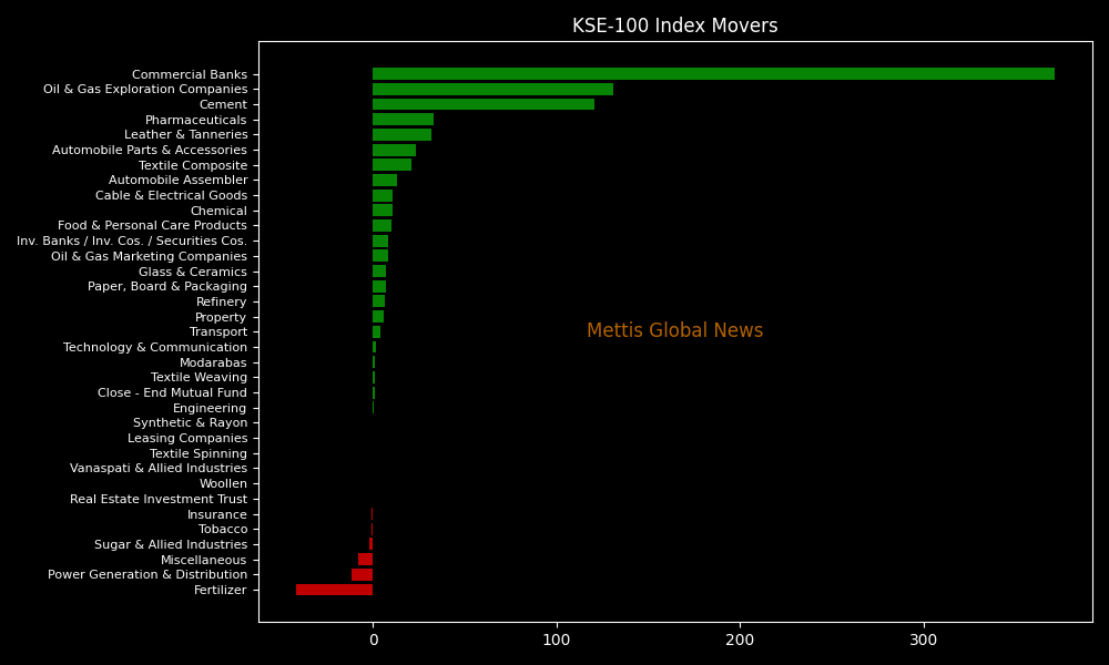 Sector-wise, KSE-100 Index was supported by Commercial Banks (+371.31pts), Oil & Gas Exploration Companies (+130.80pts), Cement (+120.70pts), Pharmaceuticals (+32.79pts), and Leather & Tanneries (+32.01pts).