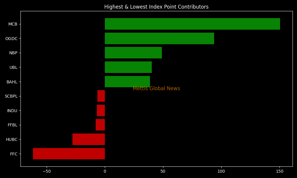 In terms of index-point contributions, companies that propped up the index were MCB (+150.56pts), OGDC (+93.92pts), NBP (+49.10pts), UBL (+40.24pts), and BAHL (+38.76pts).